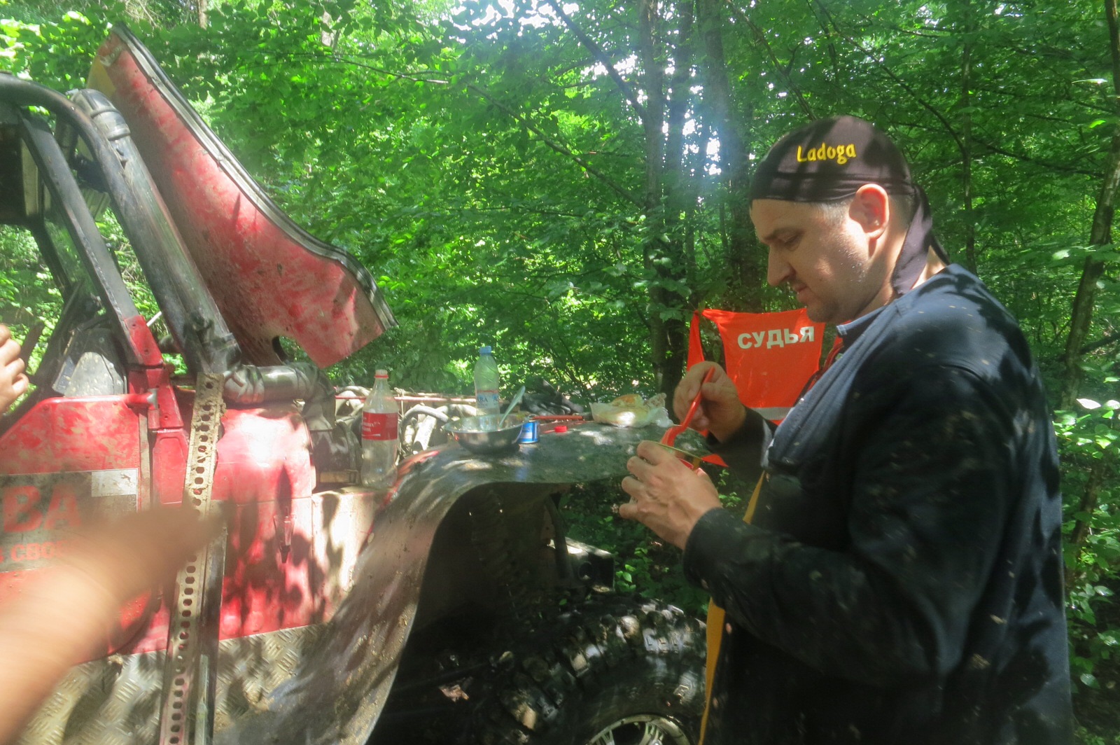 Гонка для нашей команды сложилась драматично. Стартуем на первый СУ. Через 5 км заменённый накануне паразитный ролик заклинивает и рвутся все ремни. Остаёмся без помпы, генератора, гидроусилителя. Разворачиваемся и мелкими перебежками с отстоем на охлаждение добираемся до лагеря. Запасной ремень не одевается из-за малой длины. Пришлось ехать в Краснодар и покупать новый ремень и натяжной ролик. Отремонтировав машины, только в районе 17 часов стартуем и выдаём второе время на круге. У Тюриных 3 часа 03 минуты, у нас 3 часа 7 минут. Утром в 5 часов 44 минуты стартуем на второй СУ. Примерно через 15 км разваливается ступичный двухрядный ивековский подшипник. Разбираем и видим зализаны шлицы на наружной гранате и ступице. Повезло, что сломались на верхушке хребта и была связь. Звоним в лагерь. Представители команды едут в магазин, ждут открытия и покупают все запчасти. Выезжают к нам. Не доехали 2 км. Пешком в руках приносят правый привод в сборе, поворотный кулак, ступицу и по мелочи подшипники, сальники. Всё это устанавливается на машину и дальше едем, нет низко летим на финиш. Группа поддержки пешком уходит к оставленной машине. Контрольное время на СУ 8 часов, финишировали через 7 часов 59 минут. Всё зачёт второго СУ. По итогам двух СУ в зачёте ОЧКК третье место. Это третье место дорогого стоит. Чистое время на СУ без учёта времени ремонта у нас получилось 2 часа 57 минут.