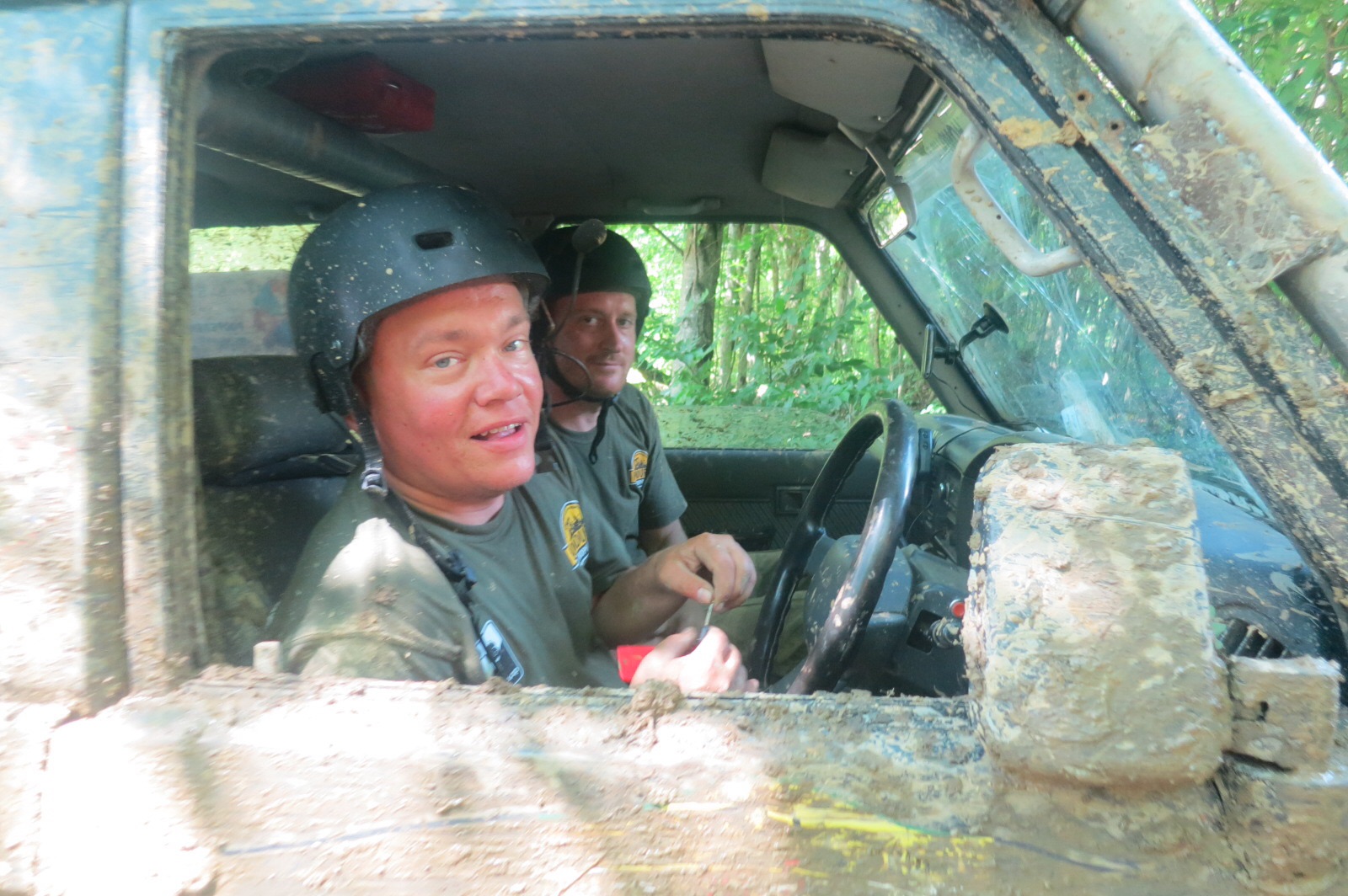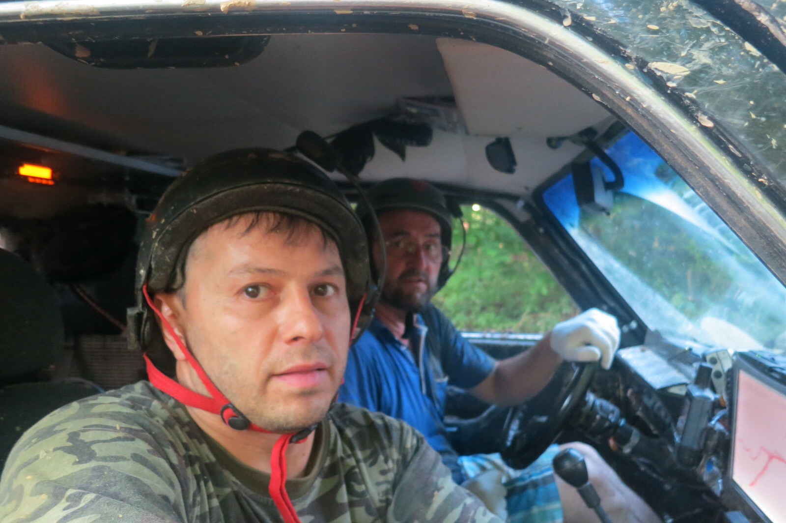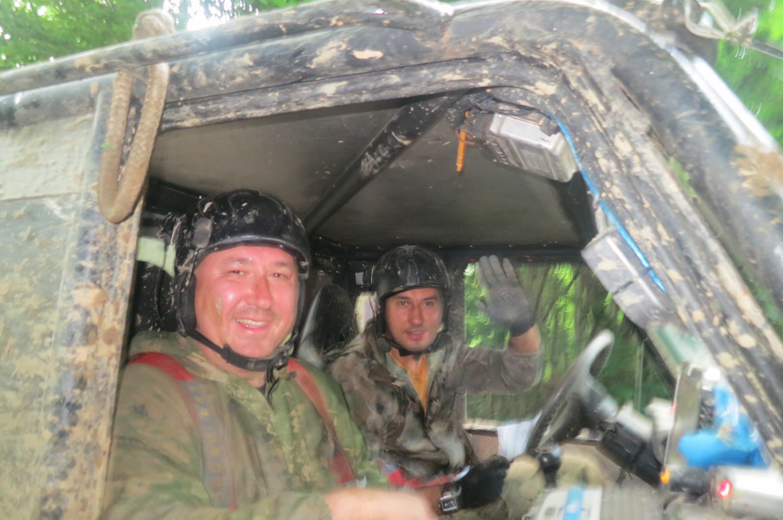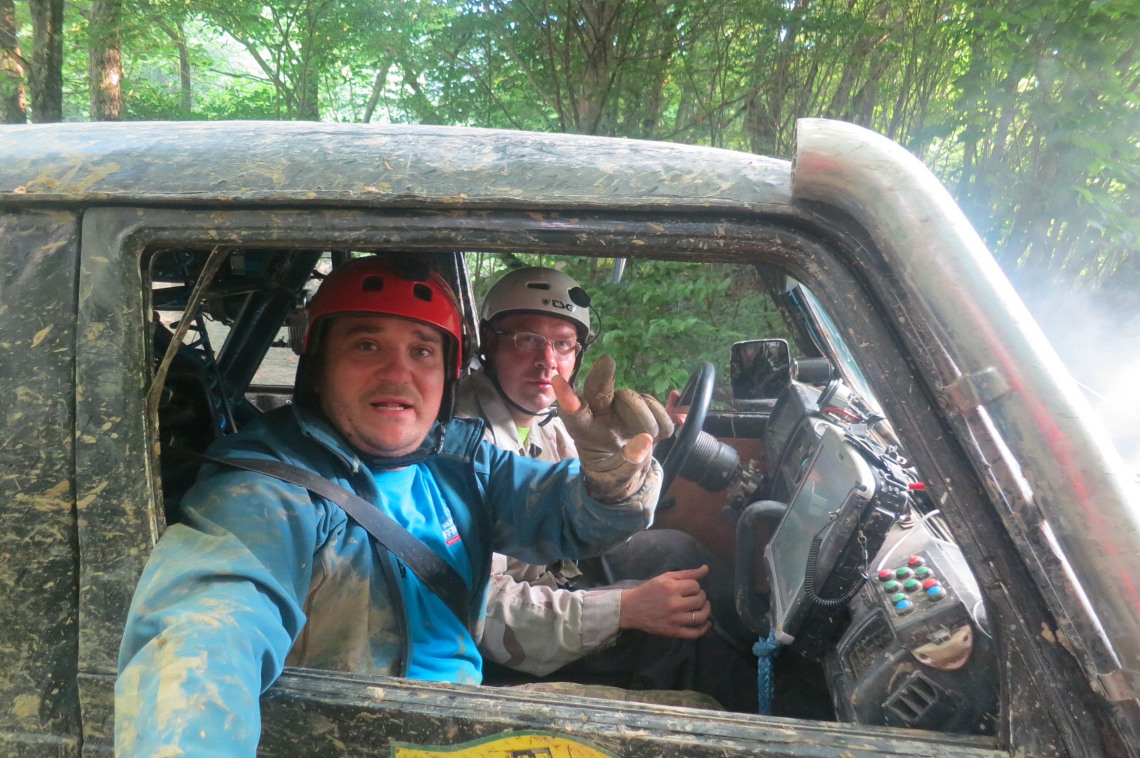Мне сказали, что в каком то месте, обогнав машину не участников в лесу, Хищник налетел на бревно и в какой-то момент ехал на двух колесах и за малым не улетел в кювет. Честно говоря, не помню этого, или не заметила